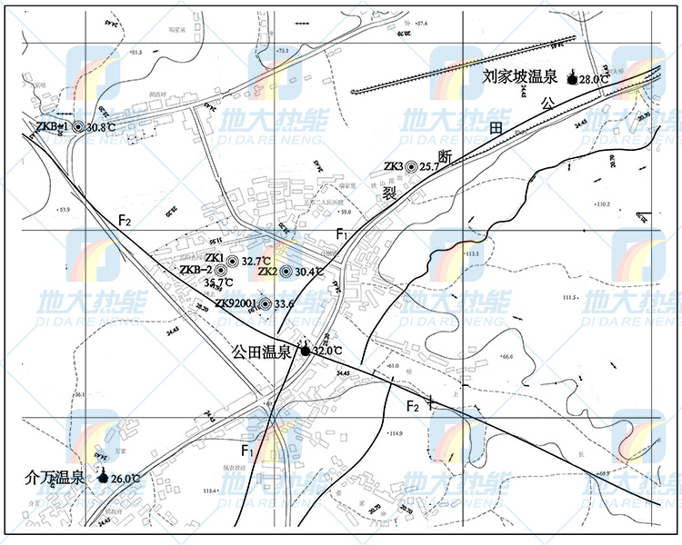 根據抽水試驗實測涌水量、水溫結合鉆孔與區(qū)內斷裂構造的相對位置分析,靠近F2則相對富水,水溫亦升高;且隨著含水層(公田斷裂破碎帶)埋深的增大,揭露的地下水溫也增高;地下水溫度與含水層埋深有關,也和地下水賦水空間與深部熱源溝通程度有關。