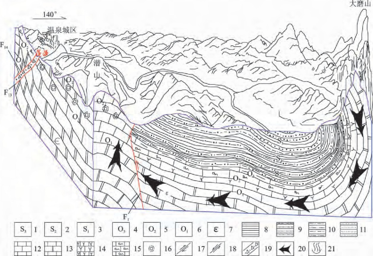 咸寧地質(zhì)構(gòu)造位置處于揚(yáng)子準(zhǔn)地臺梁子湖坳陷與咸寧臺褶束的交接部位,從屬于大幕山復(fù)式背斜北翼的次級構(gòu)造—高橋向斜、孫鑒鋪倒轉(zhuǎn)背斜、賈家山倒轉(zhuǎn)向斜的西延部分,由一系列的緊密褶皺組成區(qū)內(nèi)的基本構(gòu)造骨架。新華夏晚期構(gòu)造體系在潛山一帶表現(xiàn)強(qiáng)烈,其中大義山式斷裂有明顯的反映。這些不同的構(gòu)造體系互相干擾、復(fù)合,不僅控制了區(qū)內(nèi)的巖性組合、地貌、巖溶發(fā)育,而且也嚴(yán)格控制了地下水的分布及其補(bǔ)給、運(yùn)移和排泄。潛山背斜是地?zé)崽?/a>的主要構(gòu)造骨架,其特點(diǎn)是呈梳狀,且向南東倒轉(zhuǎn),區(qū)內(nèi)溫泉斷裂規(guī)模最大,且是經(jīng)過多次構(gòu)造變動的復(fù)合性斷裂,先期為縱張斷裂且以垂直運(yùn)動為主,后期表現(xiàn)為逆向復(fù)合,并受逆時針的應(yīng)力作用而顯壓扭性特征,是深切割斷裂,也是控制區(qū)內(nèi)地?zé)崃黧w分布的主要斷裂。