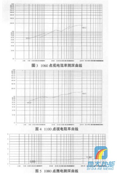(2)在100線1060、1100點(diǎn)上進(jìn)行電阻率測(cè)深, 從二個(gè)點(diǎn)的曲線形態(tài)來(lái)看,曲線形態(tài)相似且地層分層明顯;70~200m層位穩(wěn)定,基本為砂巖(見(jiàn)圖3~4)。