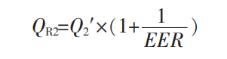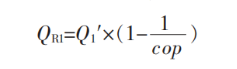 式中:QR1 為巖土體提供熱量;Q1′為建筑空調(diào)總熱負(fù)荷, 2963 kW;cop 為熱泵機(jī)組制熱性能系數(shù),5.0。由式(1)得QR1=2370.4 kW, 即巖土體吸熱量2370.4 kW,滿足建筑供暖需求。巖土體制冷量計算見式(2)。